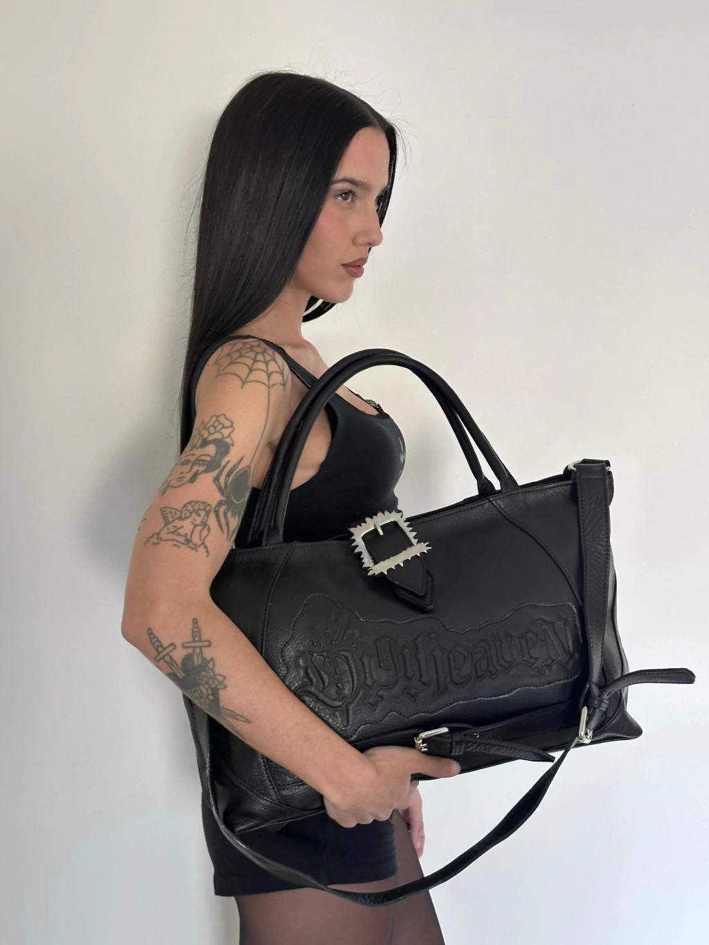 Hebilla metálica exclusiva Digiheaven Spikes, realizada en metal niquelado con grabado láser de marca